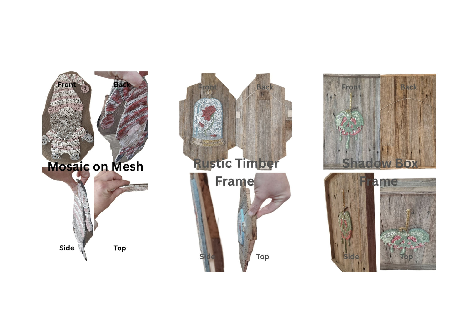 Select Your Display Option – Choose from mesh-mounted (for direct installation), rustic timber framing, or a recycled shadow box frame. Each option is crafted for either permanent installation or ready-to-hang display.