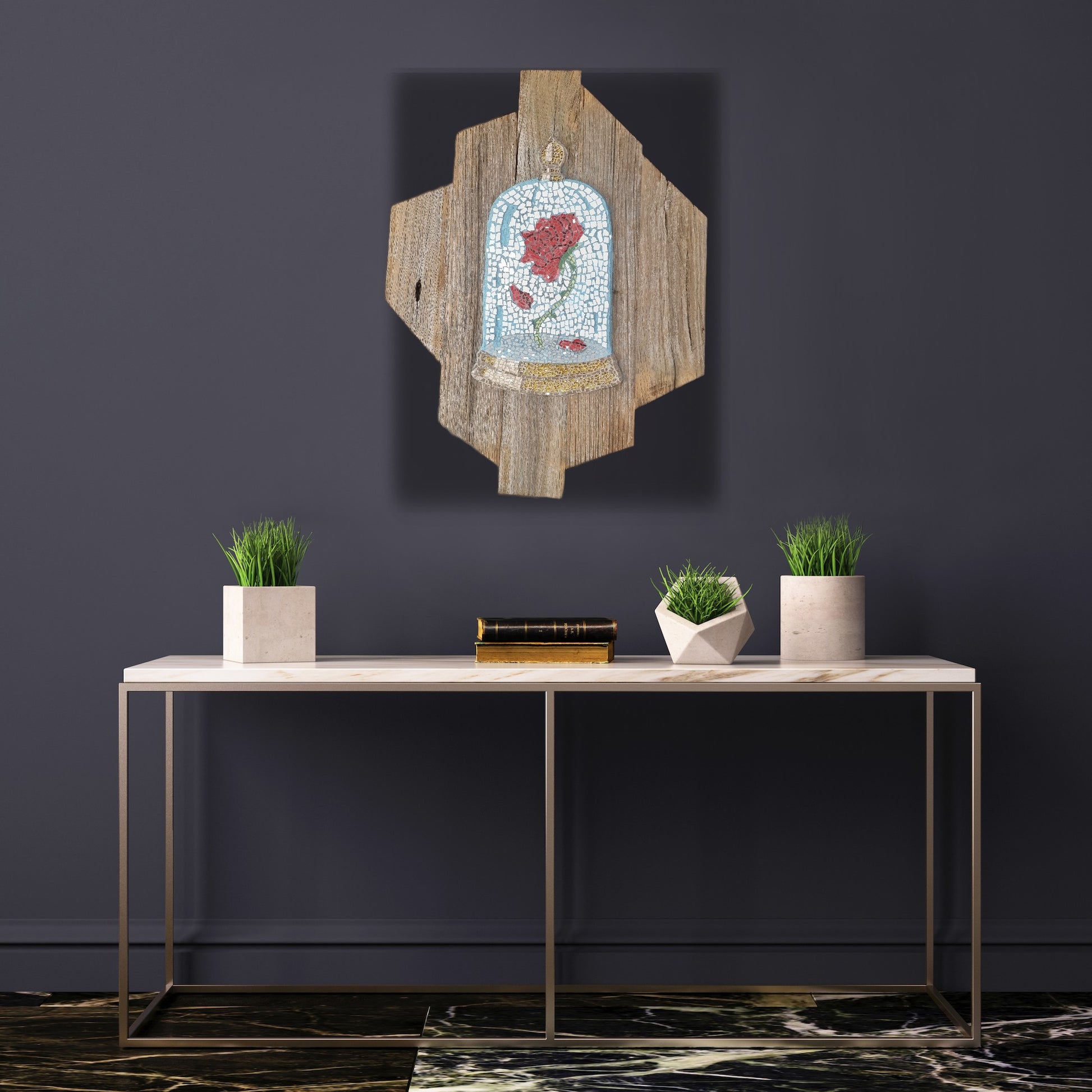 Inspired by the enchanted rose from Beauty and the Beast, The Cursed Rose captures a moment suspended in time — love, sacrifice, and transformation held beneath glass. Each tile has been placed by hand to honour the quiet emotion of the story, not just its symbolism.