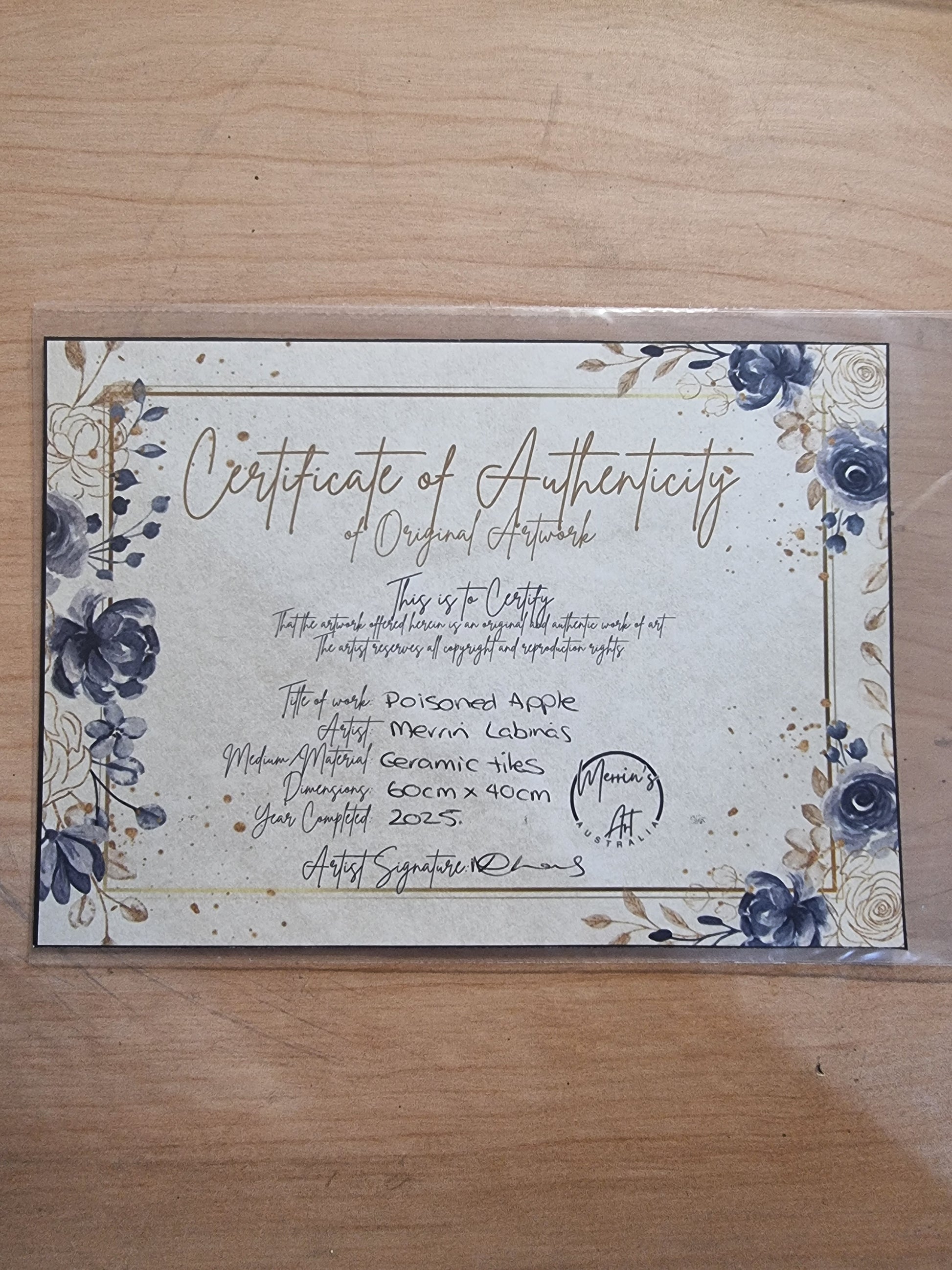 This striking mosaic captures the mystique and allure of the poisoned apple, a timeless symbol of temptation and consequence. Crafted with exquisite detail and mounted within a sleek shadow box frame, this piece transforms an iconic story into a captivating work of art.